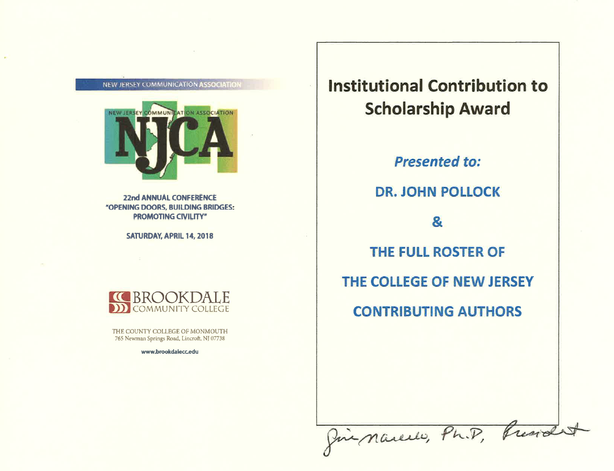 Accepting the award along with six TCNJ Communication Studies students, Dr. Pollock commented: “We are all excited to accept this award for faculty mentoring and student-faculty collaboration. I design my communication research methods and international communication classes so that students are motivated to meet not simply undergraduate, but rather ‘professional” standards of excellence, generating multiple drafts to craft papers suitable for presentation at scholarly conferences at state, national, and international levels. Our TCNJ students were the first undergraduates to receive a ‘best student paper’ award at the first annual conference of the NJCA in 1997, and our students have earned “best student paper” awards in between one third to one half of the additional 21 conferences since that year. I could not be more delighted by the careful mentoring of every faculty member in the Communication Studies Department, and by the dedication and industry of our highly talented students. I hope the presentations and awards at the NJCA conference will inspire our students to set higher and more ambitious personal and professional goals.”
