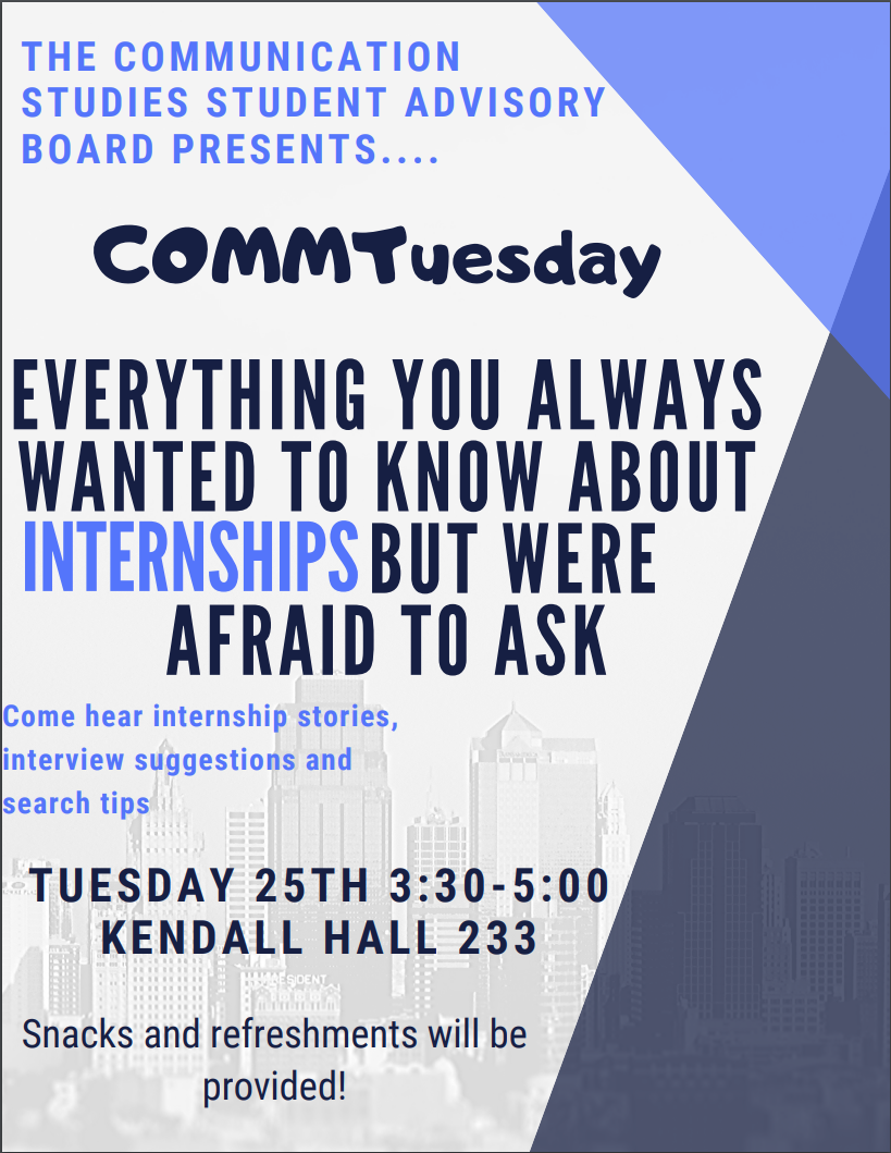 Join us for the first CommTuesday of the semester, “Everything you wanted to know about Communication Internships but were Afraid to Ask”! Free snacks and refreshments are included, come on over to Kendall Hall 233!